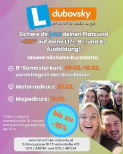 Du möchtest deinen Führerschein in Graz machen und suchst eine erfahrene Fahrschule mit klaren Kursstrukturen? Bei uns kannst du dir jetzt deinen Platz sichern und bis zu 15 % Rabatt auf deine L17-, B- oder A-Führerscheinausbildung erhalten. Aktuelle Kursstarts der Fahrschule Dubovsky Hier findest du die nächsten verfügbaren Termine für
